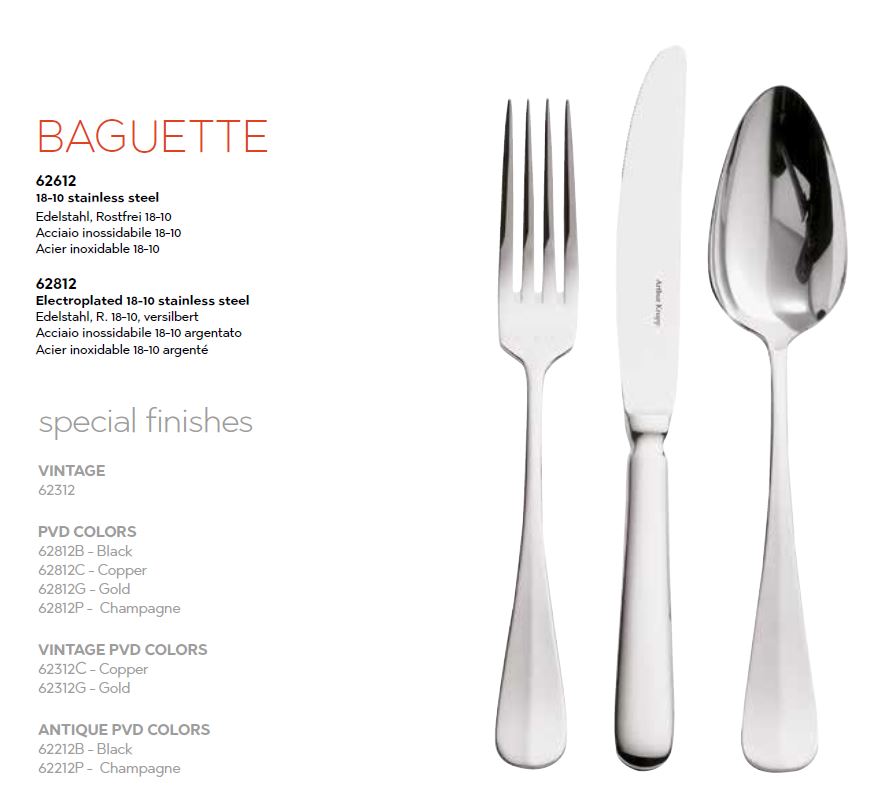 Bestek Baguette is de ultieme klassieker van Arthur Krupp. Een exclusief bestek, dat een eeuw lang meereisde aan boord van de legendarische treinen van de Wagon Lits. Dit exclusieve model is verkrijgbaar in RVS of verzilverd.