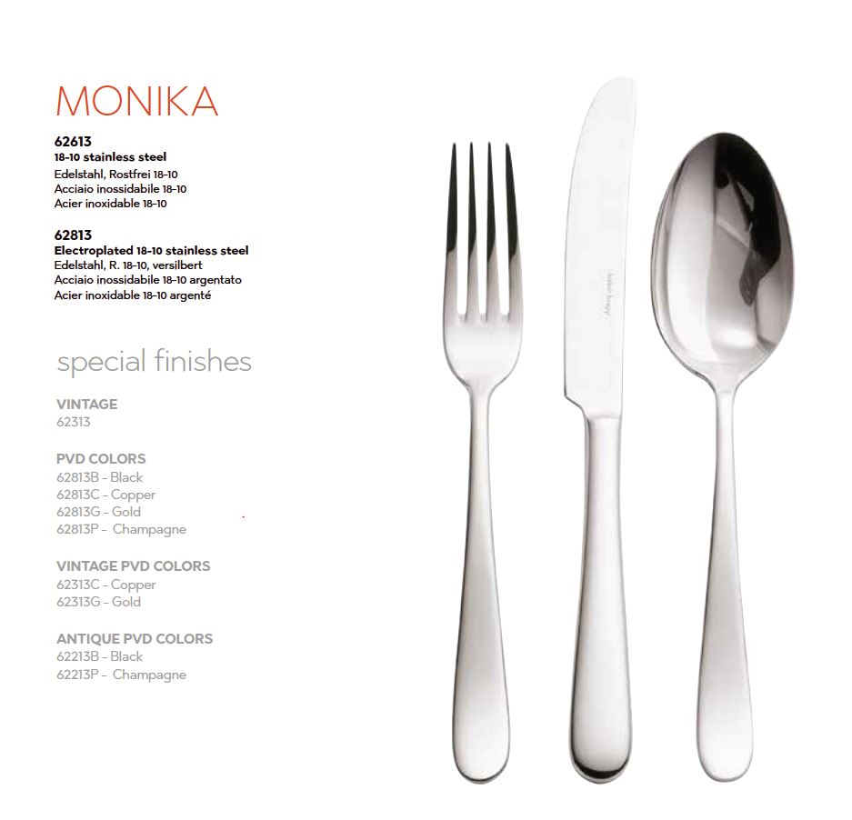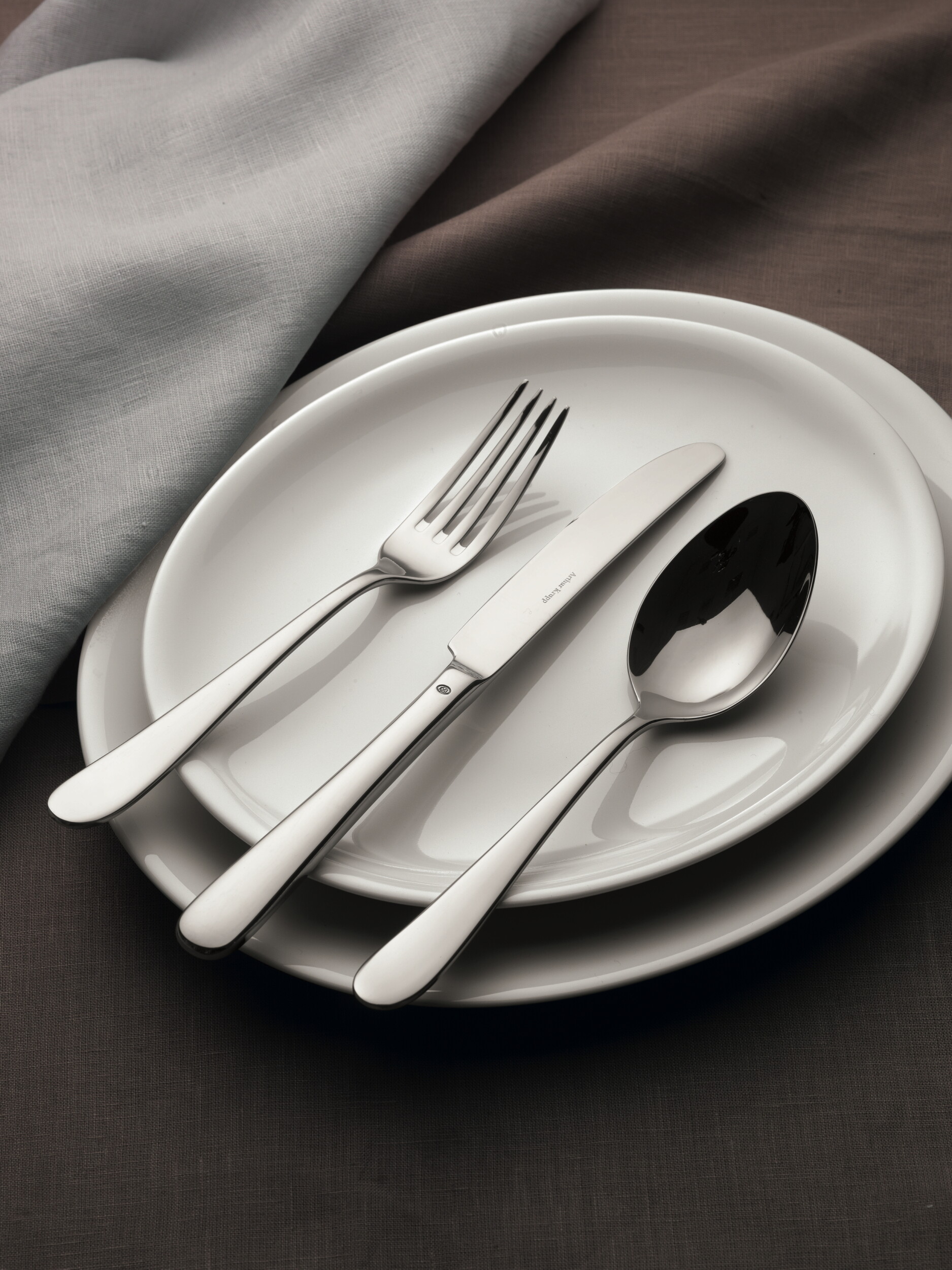 Arthur Krupp’s bestek Monika brengt stijl en verfijning in een tijdloze moderniteit. Een eenvoudige, maar stijlvolle, gestroomlijnde vorm van klasse. Standaard geleverd in 18/10 roestvrij staal en tevens beschikbaar in een verzilverde uitvoering.