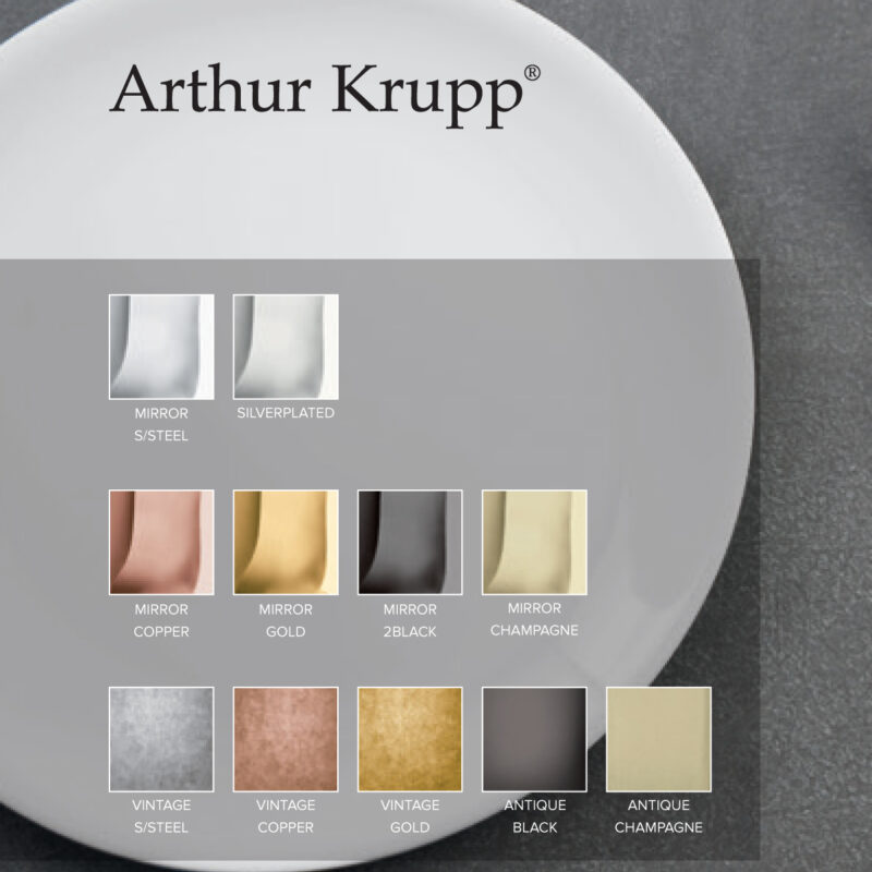 Arthur Krupp Queen wordt geproduceerd in hoogwaardig 18/10 roestvrij staal en is verkrijgbaar in diverse PVD kleuren en afwerkingen: